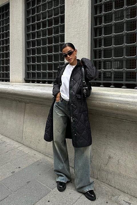 Fermuar Ve Kapşonlu Uzun Kapitone Mont 7062