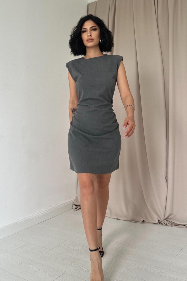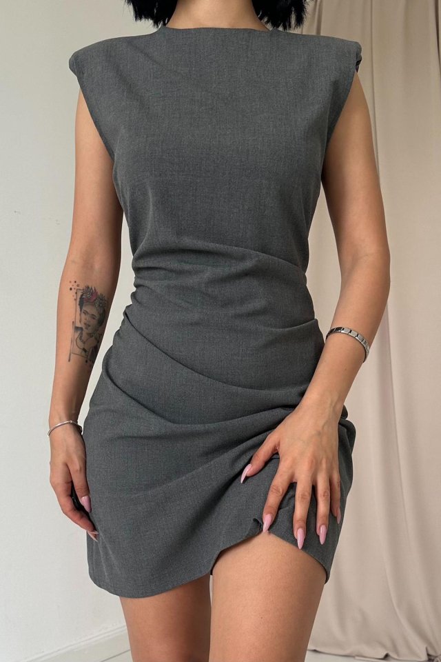 Gri Yanı Büzgülü Sıfır Kol Elbise