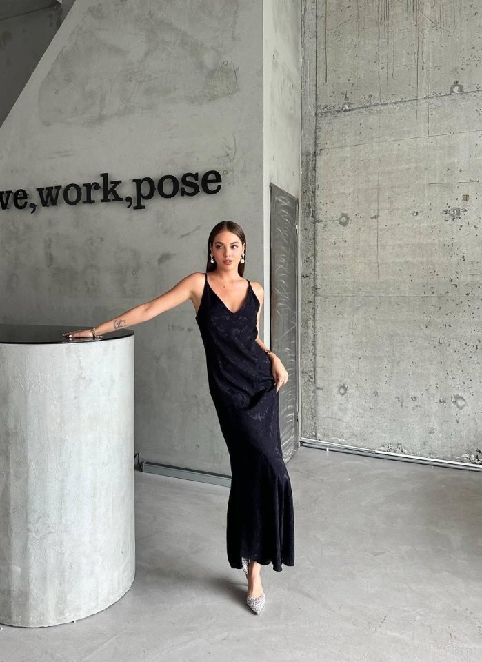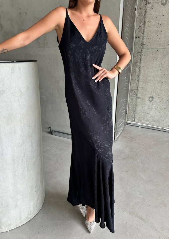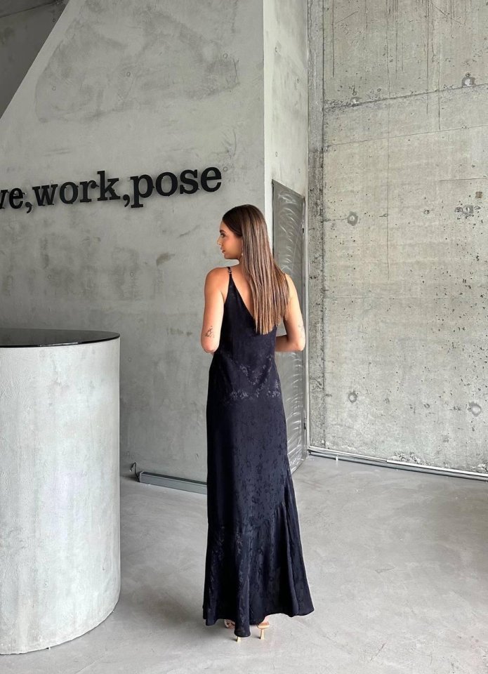 JAKARLI ASKILI SATEN ELBİSE ASİMETRİK – Siyah