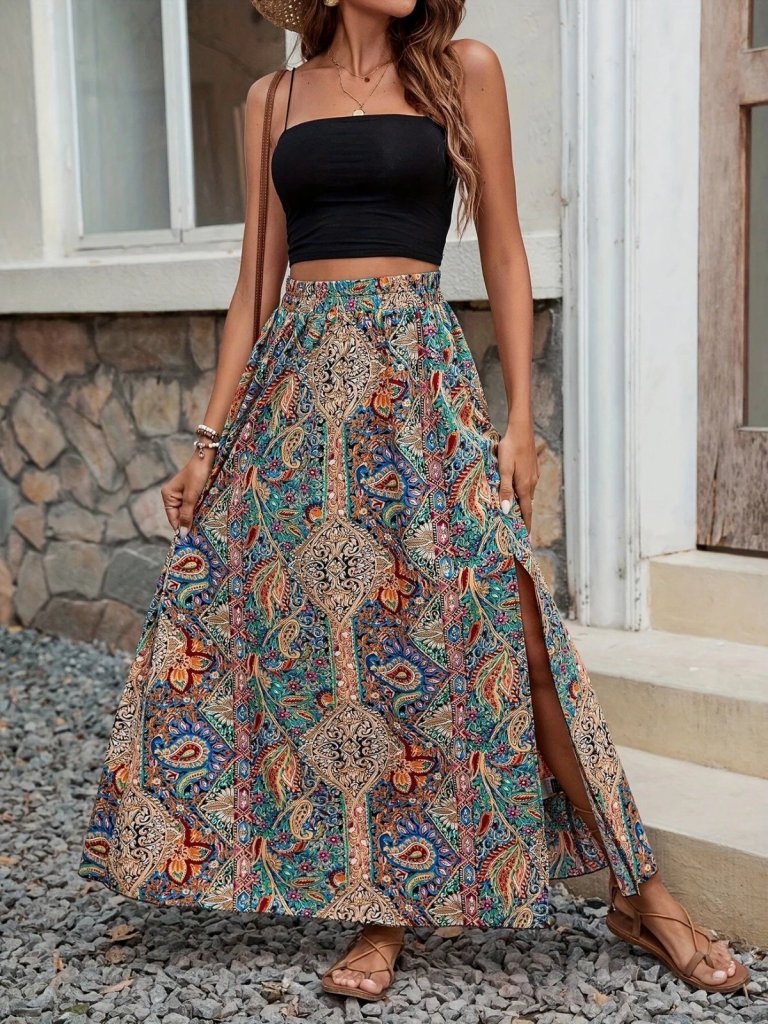 Kadın Beli Büzgülü Yandan Yırtmaçlı Desenli Süprem Etek