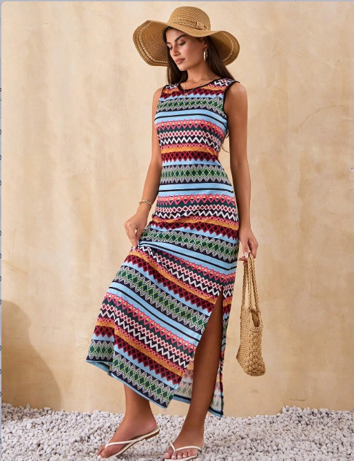 Kadın Boyundan Askılı Belden Lastikli Yandan Yırtmaç Detaylı Viskon Elbise