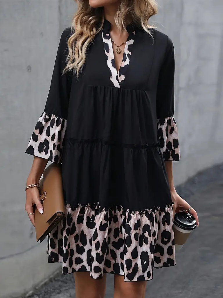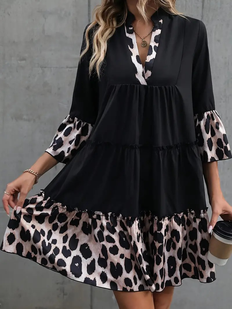 Kadın Fakir Kol V Yakalı Leopar Desen Detaylı Trikoton Elbise