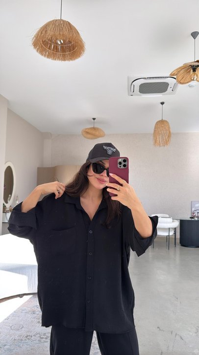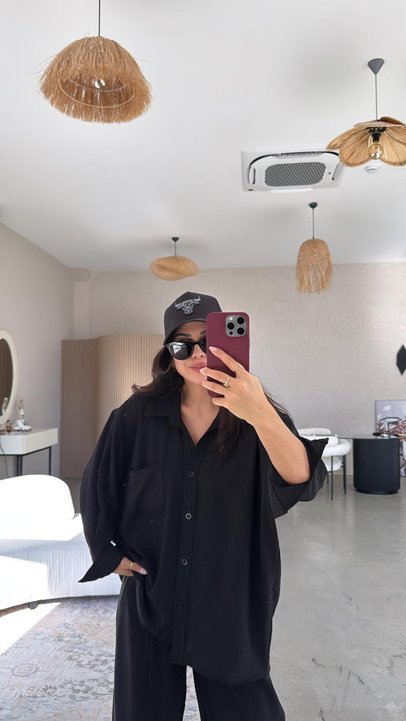 Kadın Flamlı Keten Tek Cep Oversızed Gömlek