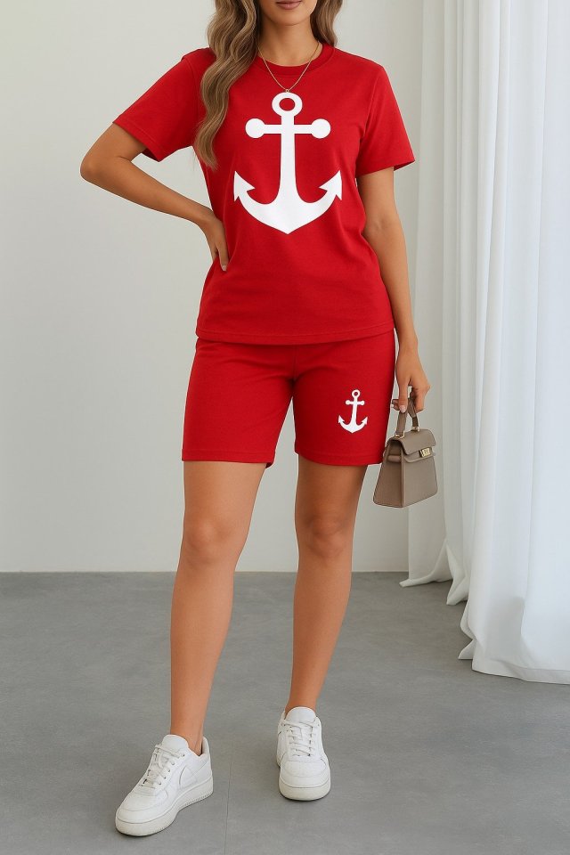 Kadın Kısa Kollu çapa Baskılı Viskon Ikili Takım