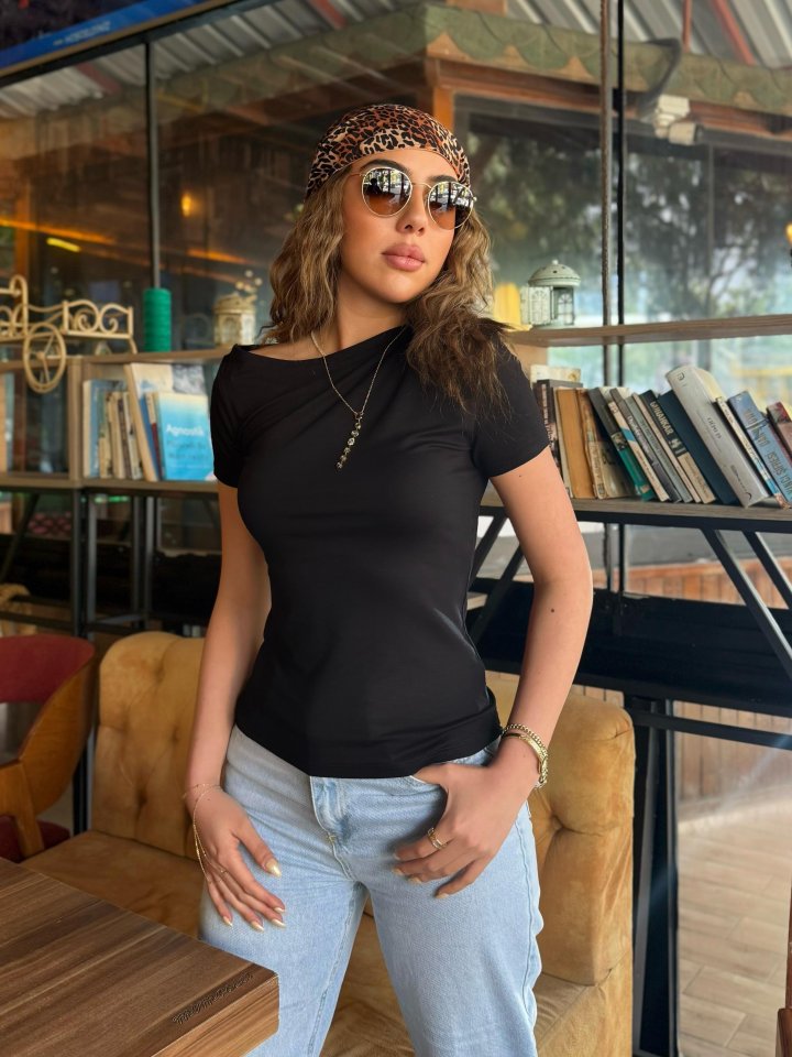 Kadın Kısa Kollu Tek Omuzu Açık Büzgülü Viskon Bluz