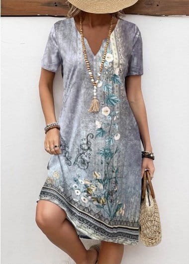 Kadın Kısa Kollu V Yakalı Desenli Süprem Elbise