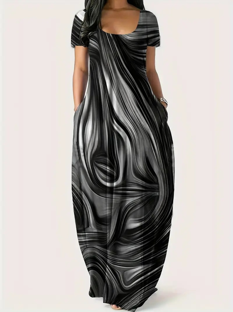 Kadın Kısa Kollu Yuvarlak Yaka Cepli Salaş Baskılı Süprem Elbise