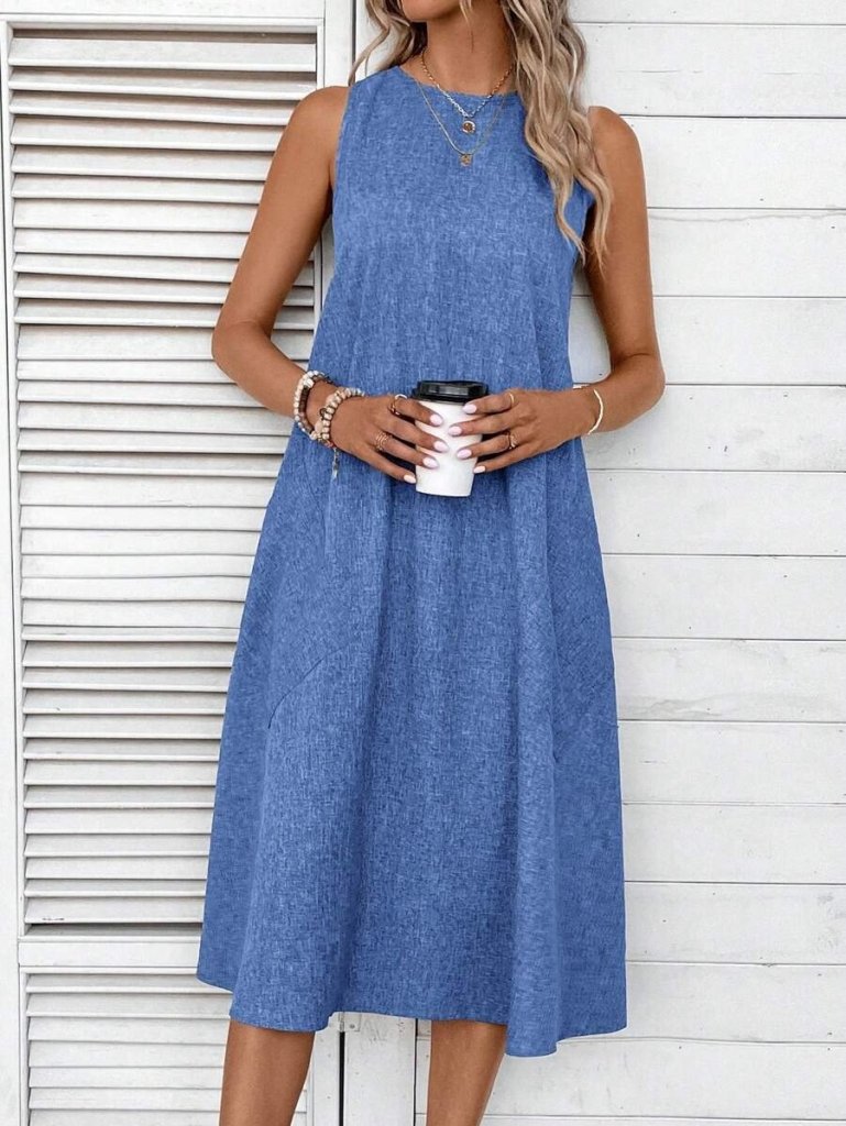 Kadın Kolsuz Bisiklet Yaka Cepli Midi Keten Elbise