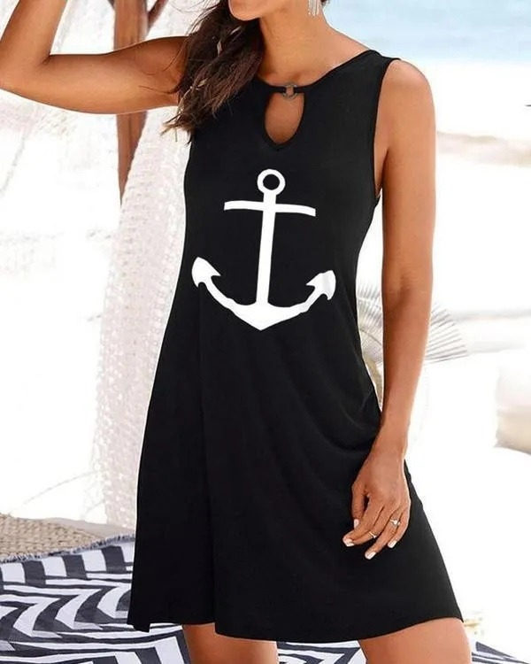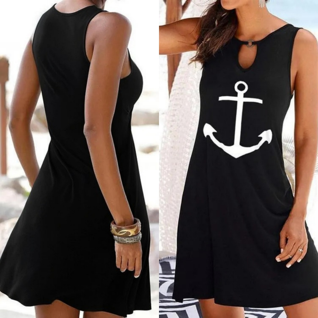 Kadın Kolsuz Halka Detay çıpa Baskılı Viskon Elbise