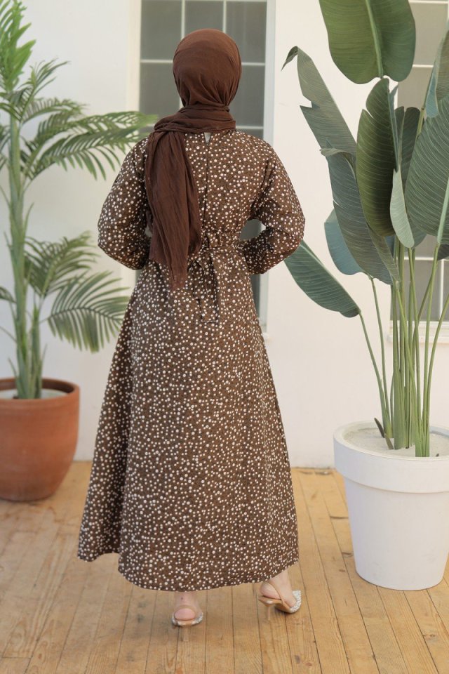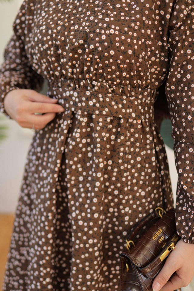 Kadın Papatya Desen Bisiklet Yaka Belden Bağlamalı Elbise