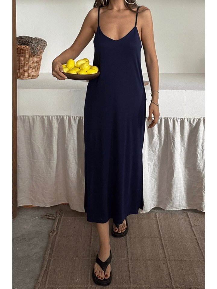 Kadın Siyah Asansör Askılı Çift Yırtmaçlı Helen Elbise