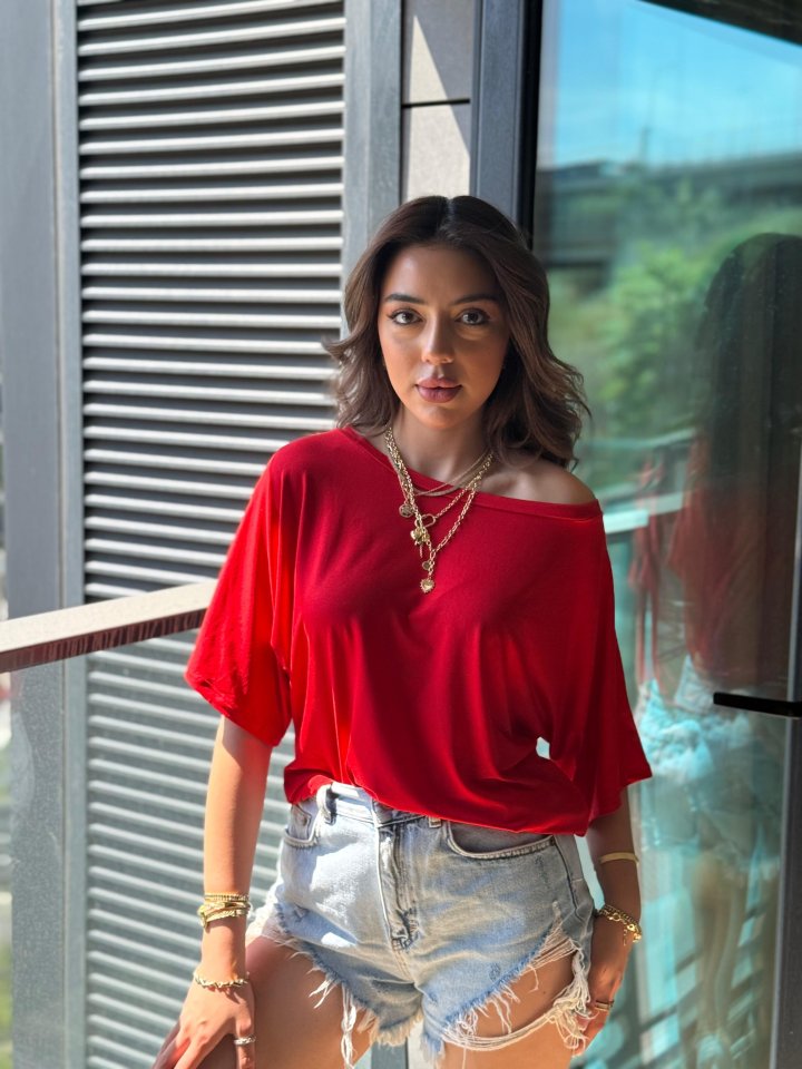 Kadın Tek Omuzu Açık Kısa Kollu Salaş Viskon Bluz