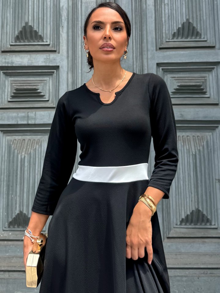 Kadın Truvakar Kol Yakası Açık Blok Renkli Krep Midi Elbise
