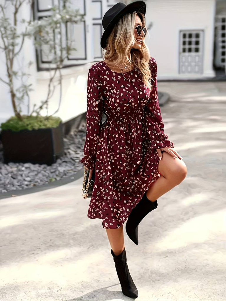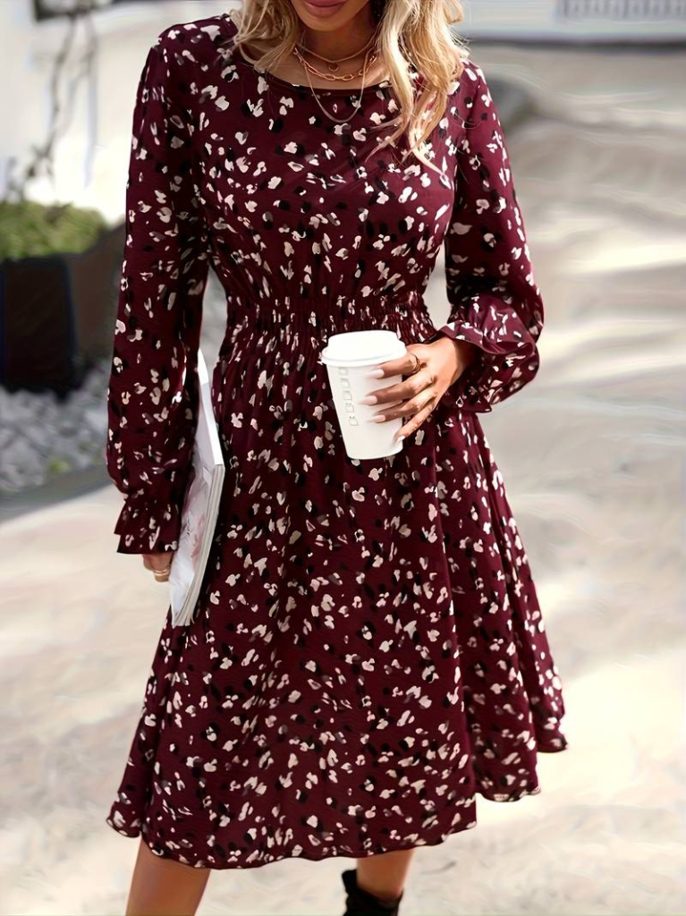Kadın Uzun Kollu Bisiklet Yaka Beli Lastikli Midi Süprem Elbise