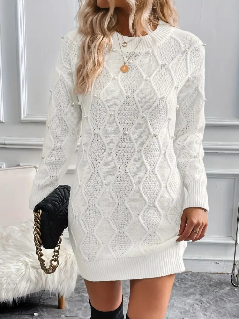 Kadın Uzun Kollu Bisiklet Yaka Desenli Triko Elbise