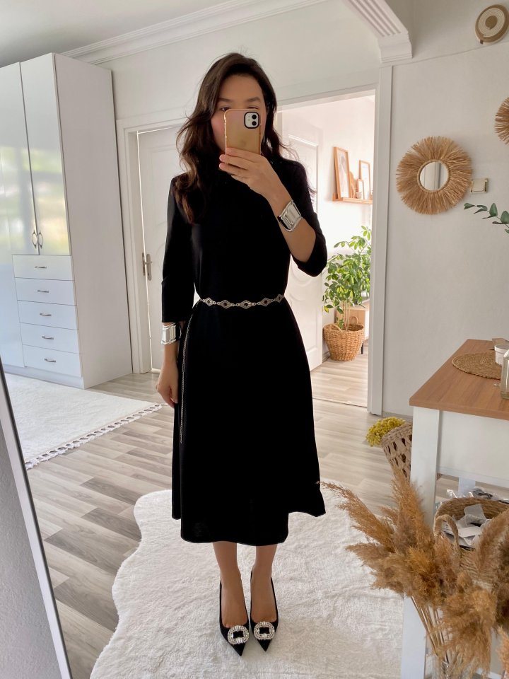 Kadın Uzun Kollu Bisiklet Yaka Midi Ithal Krep Elbise