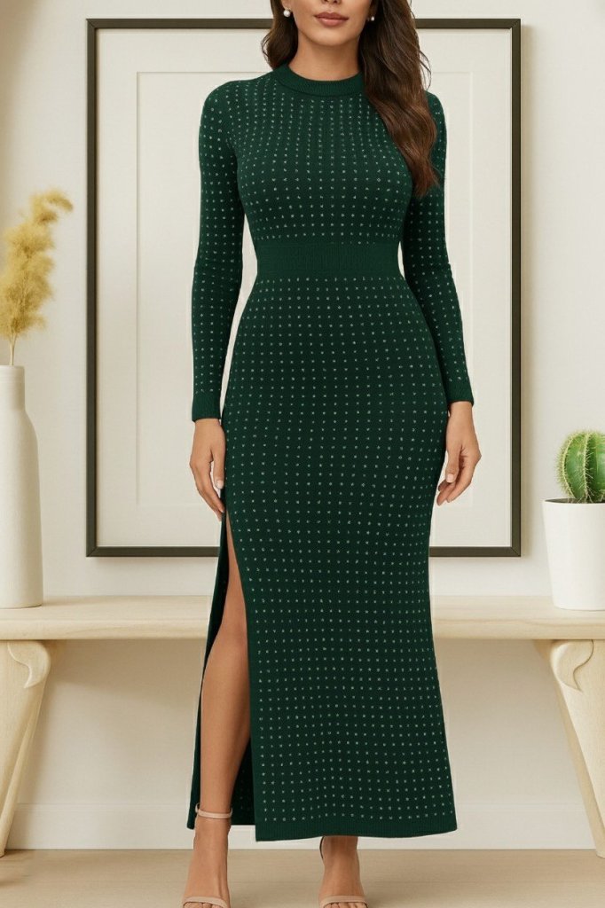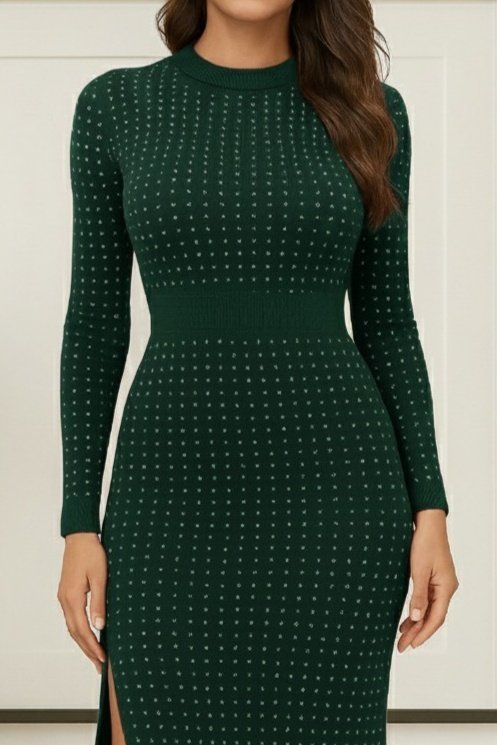 Kadın Uzun Kollu Bisiklet Yaka Taşlı Midi Kadife Elbise