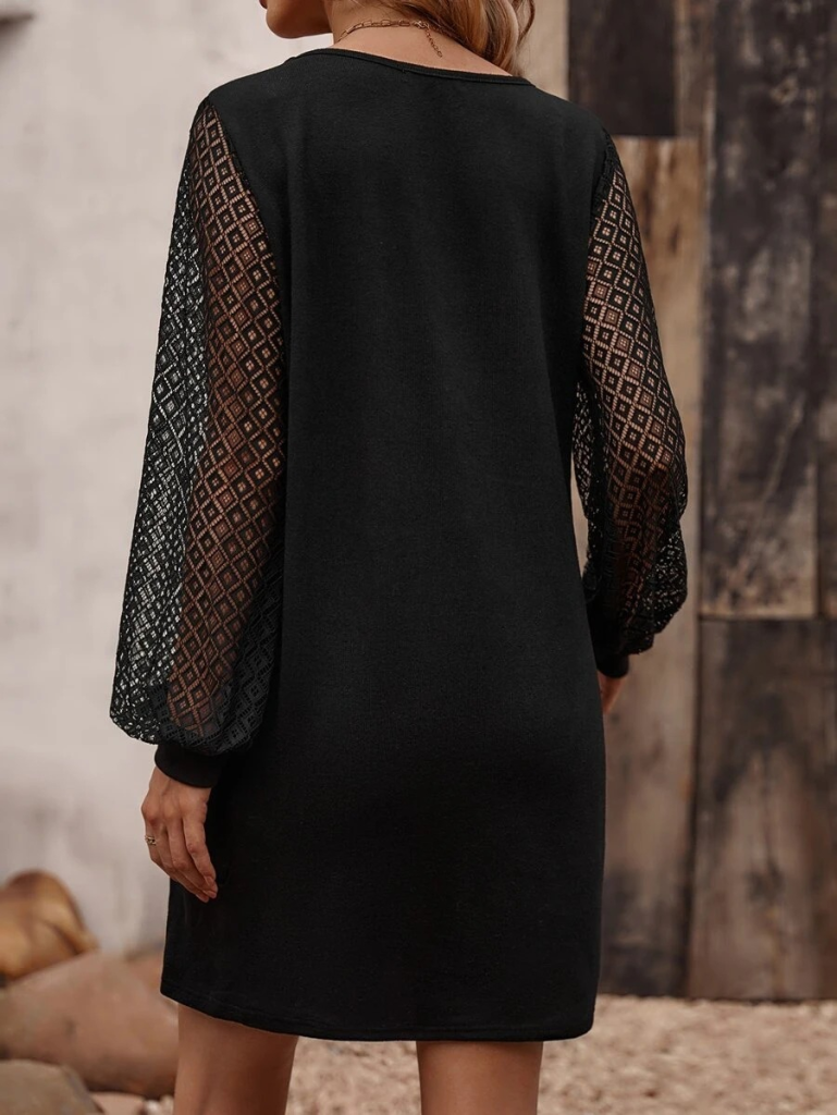 Kadın Uzun Kollu Dantelli V Yakalı Kısa Ithal Krep Elbise