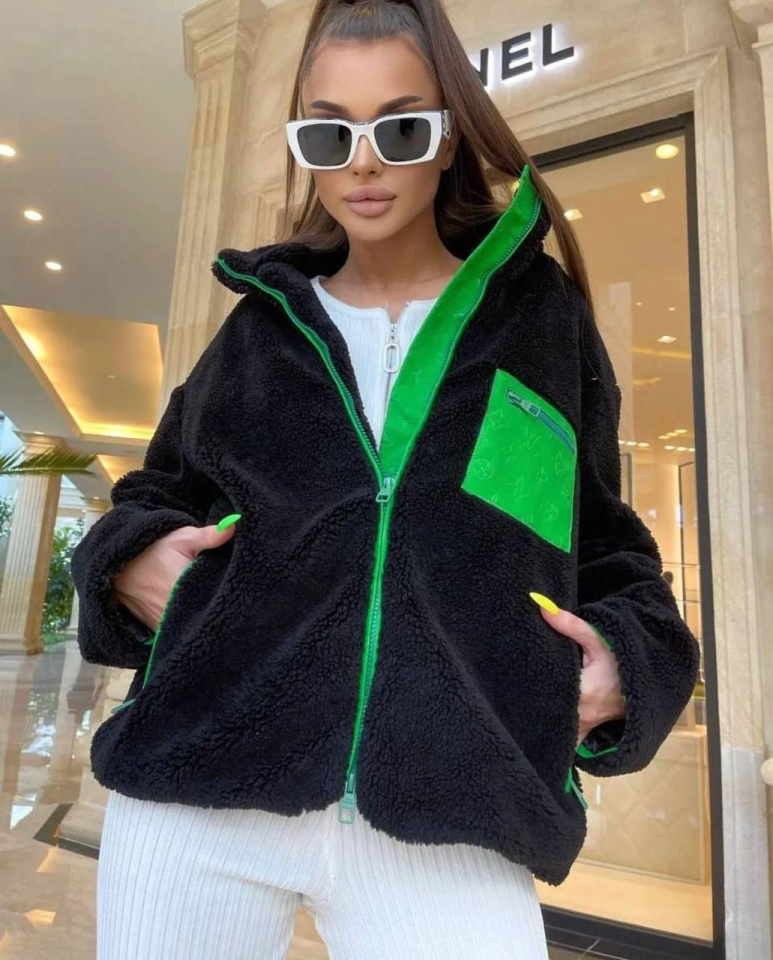 Kadın Uzun Kollu Renkli Cep Ve Fermuar Detay Peluş Mont
