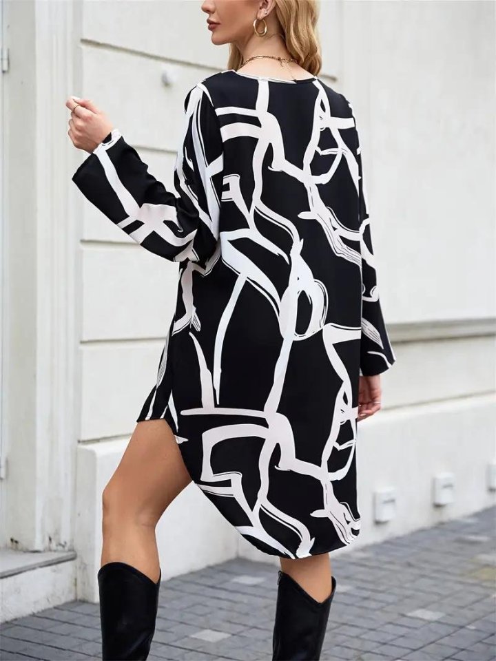 Kadın Uzun Kollu V Yakalı Desenli Dalgıç Elbise