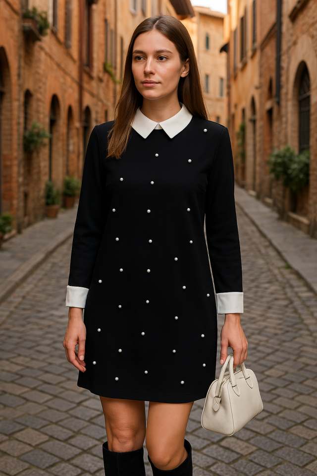 Kadın Uzun Kollu Yakalı Incili Ithal Krep Elbise