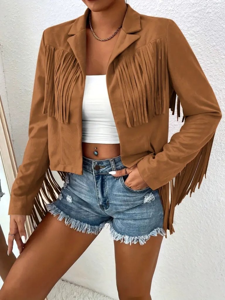 Kadın Uzun Kollu Yakalı Kısa Püsküllü Süet Ceket