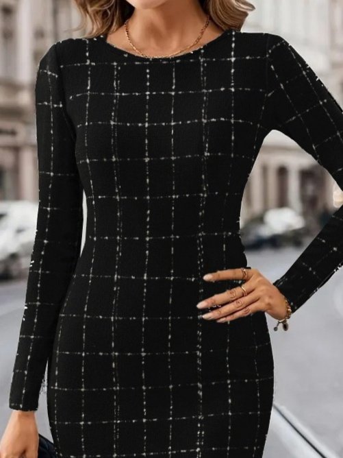 Kadın Uzun Kollu Yuvarlak Yaka Mini Dokuma Elbise