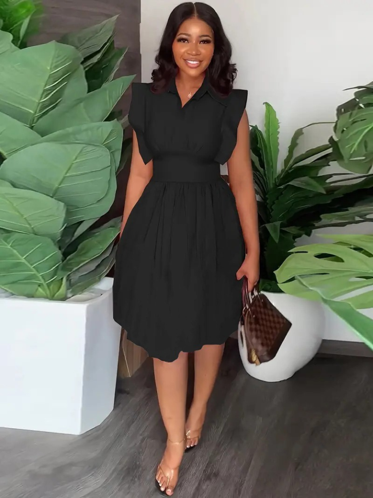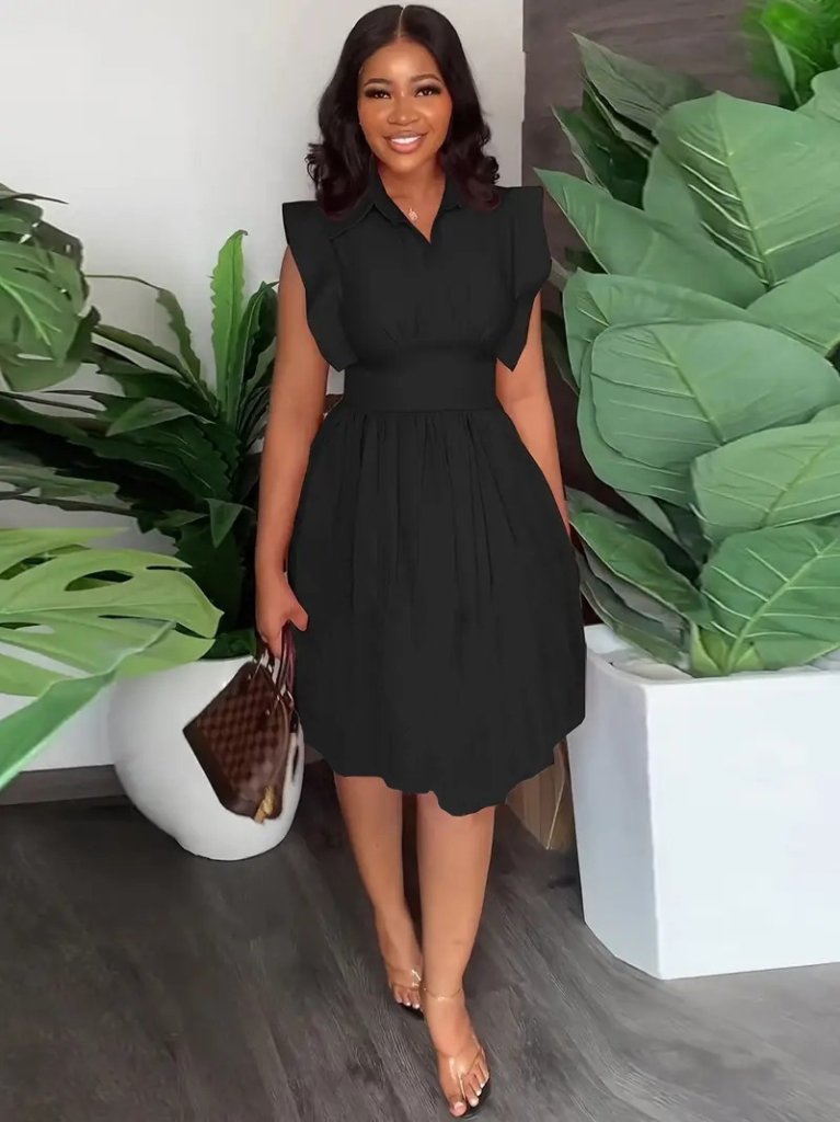 Kadın Yakalı Belden Oturmalı önden Büzgülü Dokuma Mini Elbise