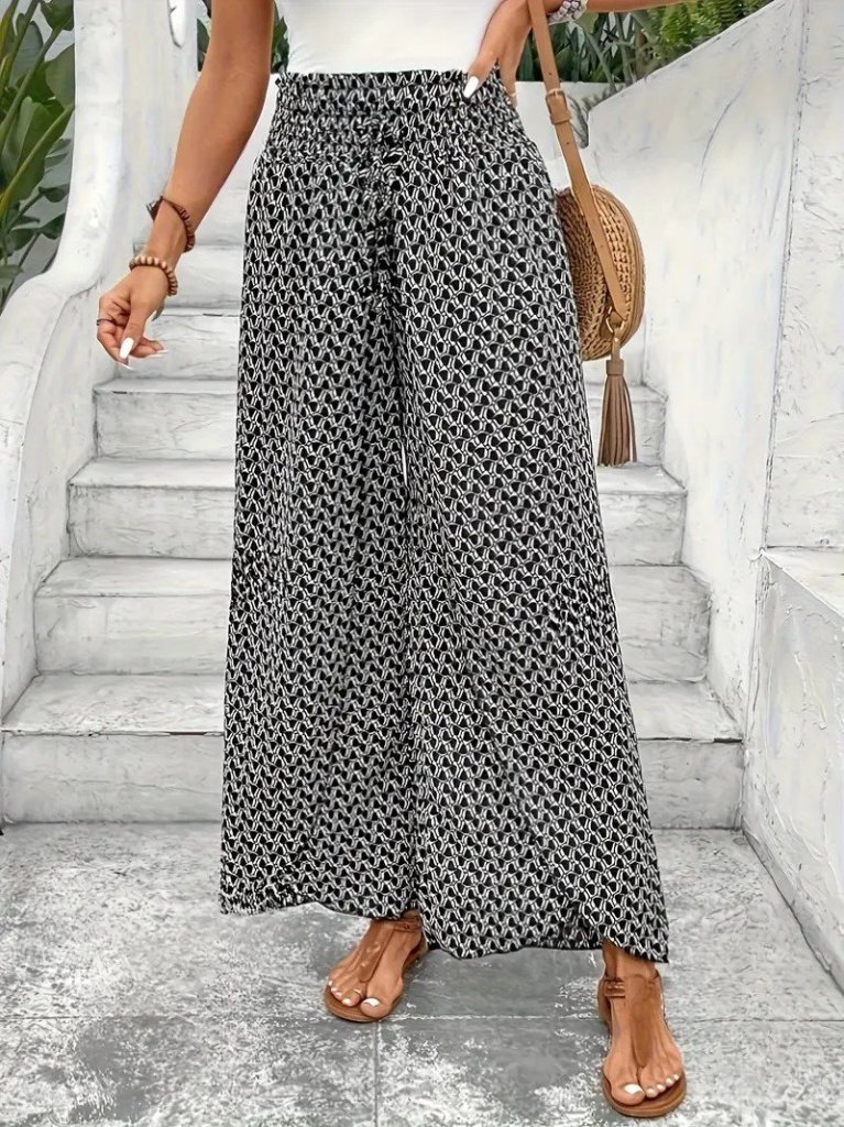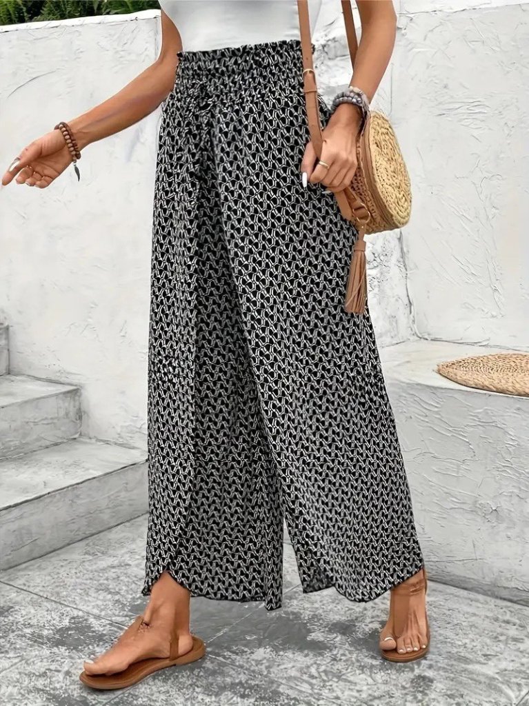 Kadın Yüksek Bel Lastikli önden Iki Parçalı Desenli Bürümcük Pantolon