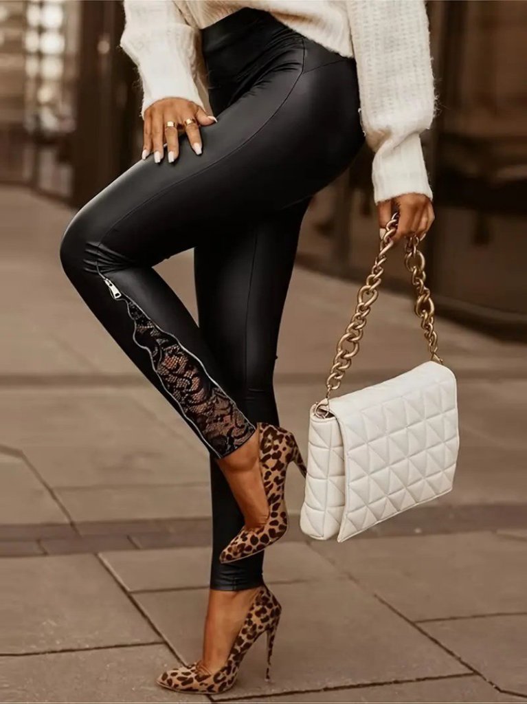 Kadın Yüksek Bel Yandan Yırtmaçlı Dantel Detaylı Deri Tayt