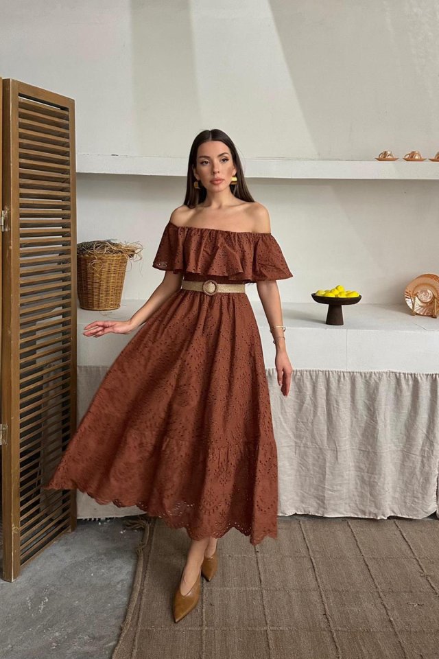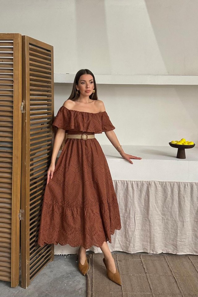 Kadın Kısa Kollu Madonna Yaka Fırfırlı Belden Yırtmaçlı Maksi örme Krep Elbise