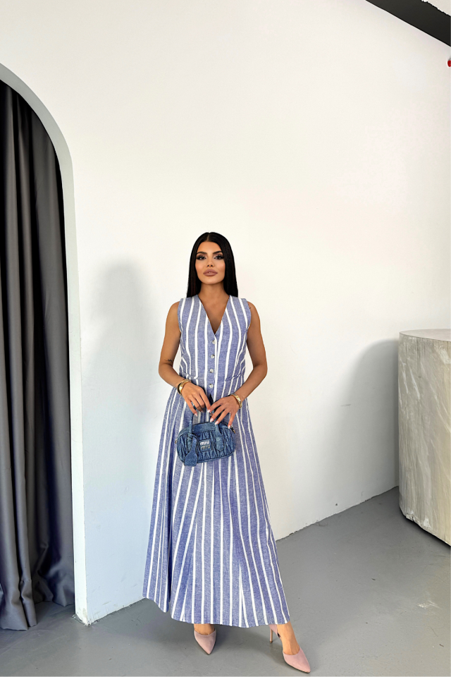 KETEN ÇİZGİLİ YELEK – UZUN ETEK TAKIM – Mavi