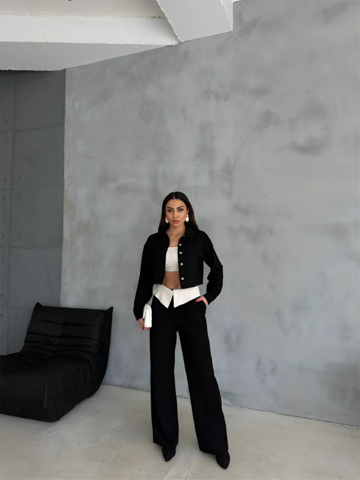 KETEN GÖMLEK-CROP-SALAŞ PANTOLON TAKIM – Siyah