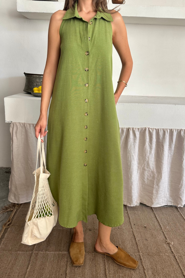 KETEN ÖNDEN DÜĞMELİ KOLSUZ GÖMLEK YAKA ELBİSE – Yağ Yeşili