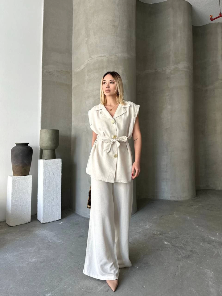 Keten Sıfır Kol Kuşaklı Ceket Pantolon Ikili Takım – Beyaz