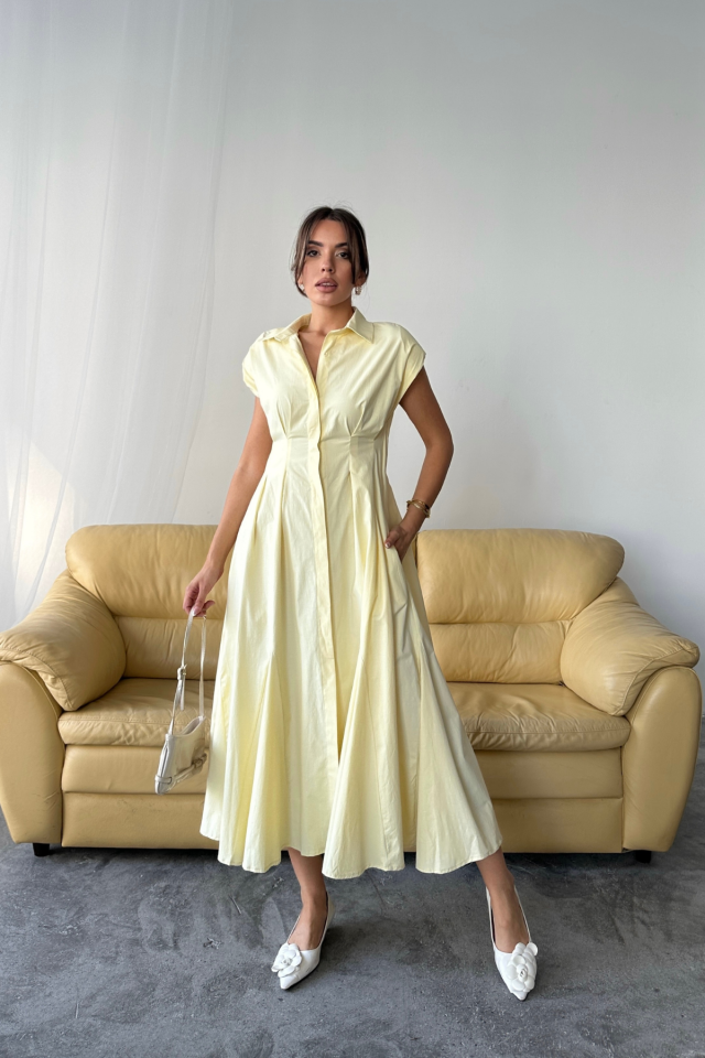 KOLSUZ VATKALI ÖNDEN DÜĞMELİBEL PENS DETAYLI POPLİN ELBİSE – Sarı