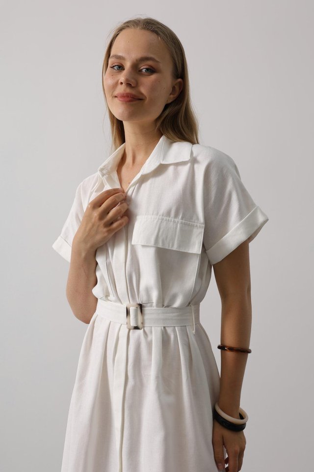 Kuşaklı Cep Detaylı Yarım Kol Elbise – Beyaz