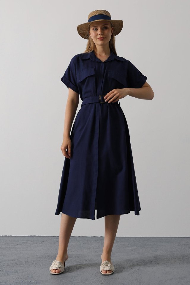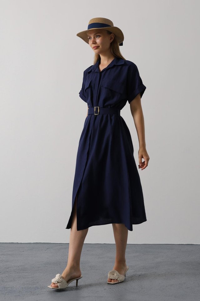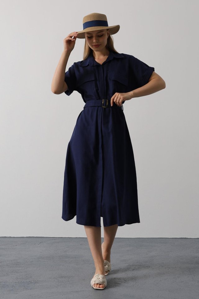 Kuşaklı Cep Detaylı Yarım Kol Elbise – Lacivert