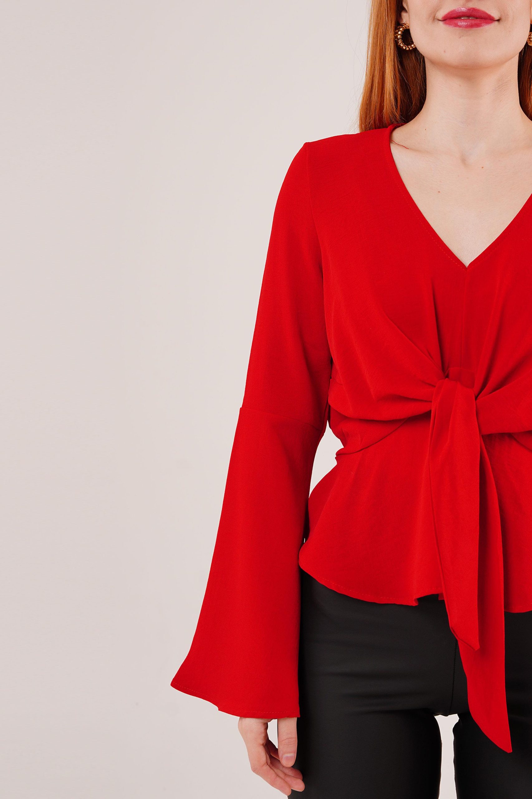 Ön Bağlamalı Volan Kol Kırmızı Bluz