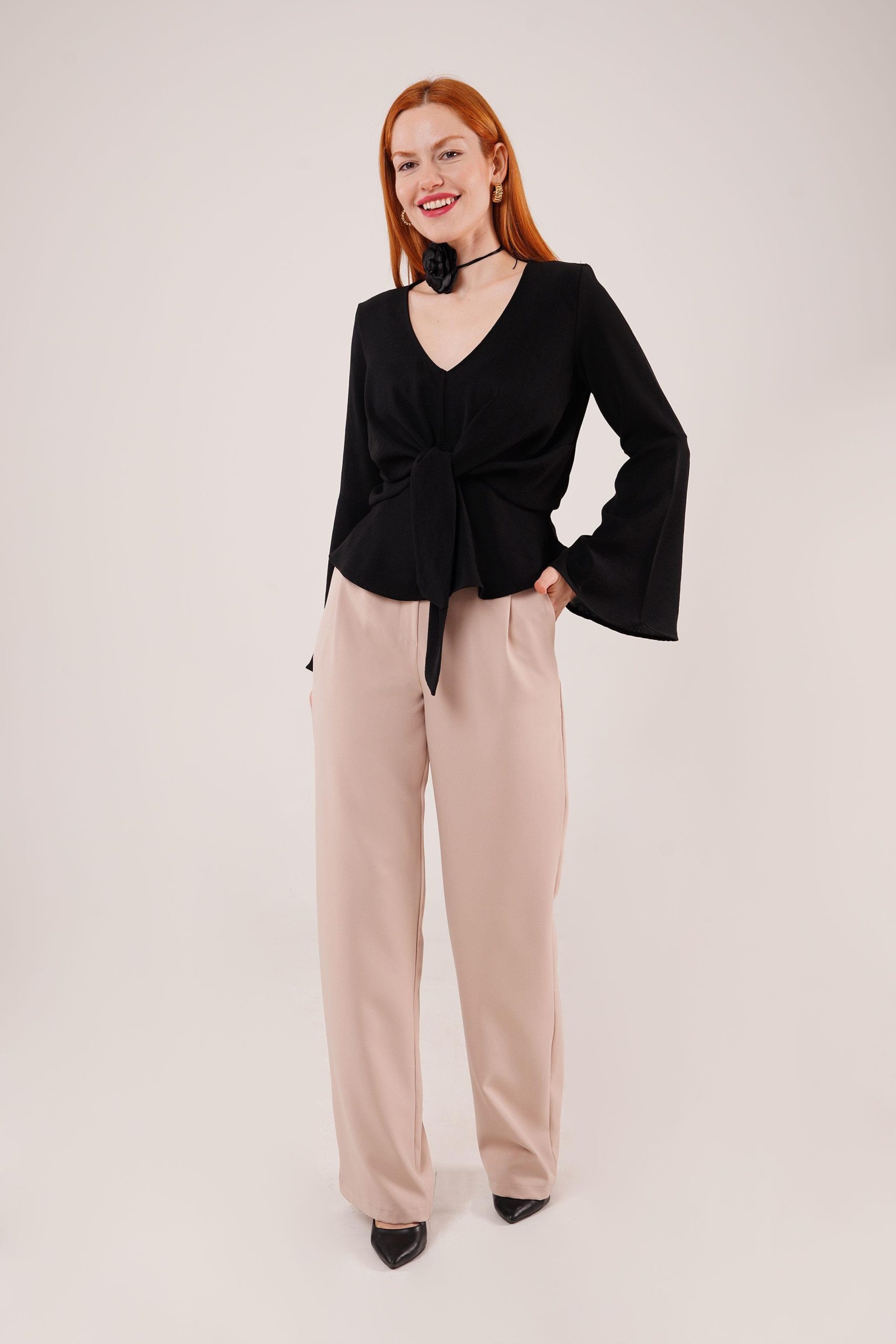 Ön Bağlamalı Volan Kol Siyah Bluz