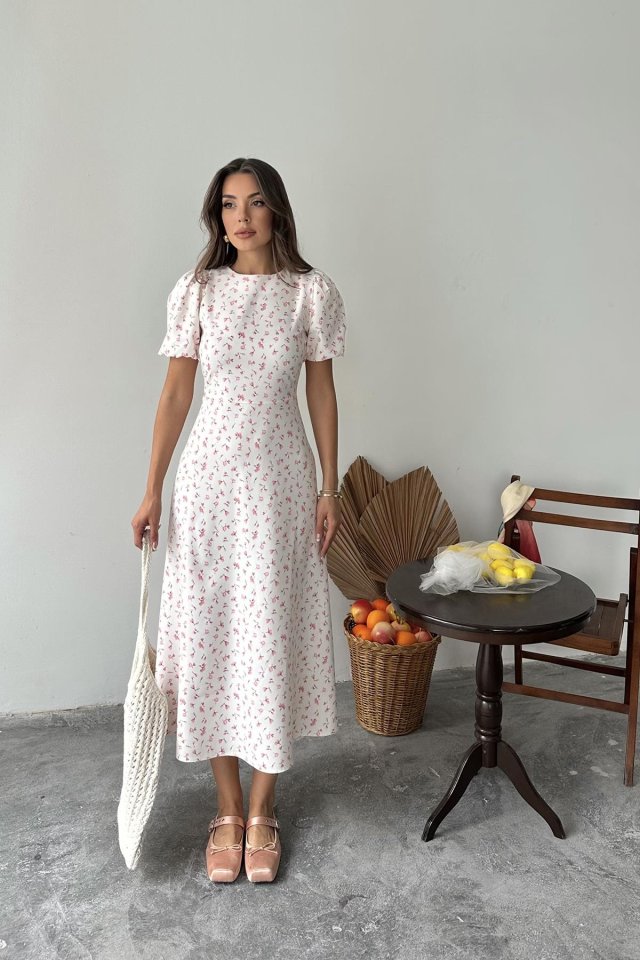 Kadın Kısa Kollu Madonna Yaka Fırfırlı Belden Yırtmaçlı Maksi örme Krep Elbise