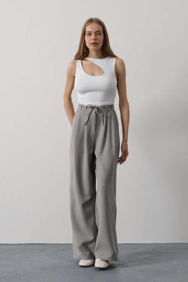 Pileli Bağcıklı Oversize Pantolon – Gri