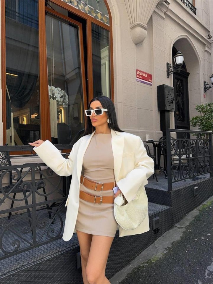 POLYVİSCON ÇİFT KEMER DETAYLI ELBİSE – Bej
