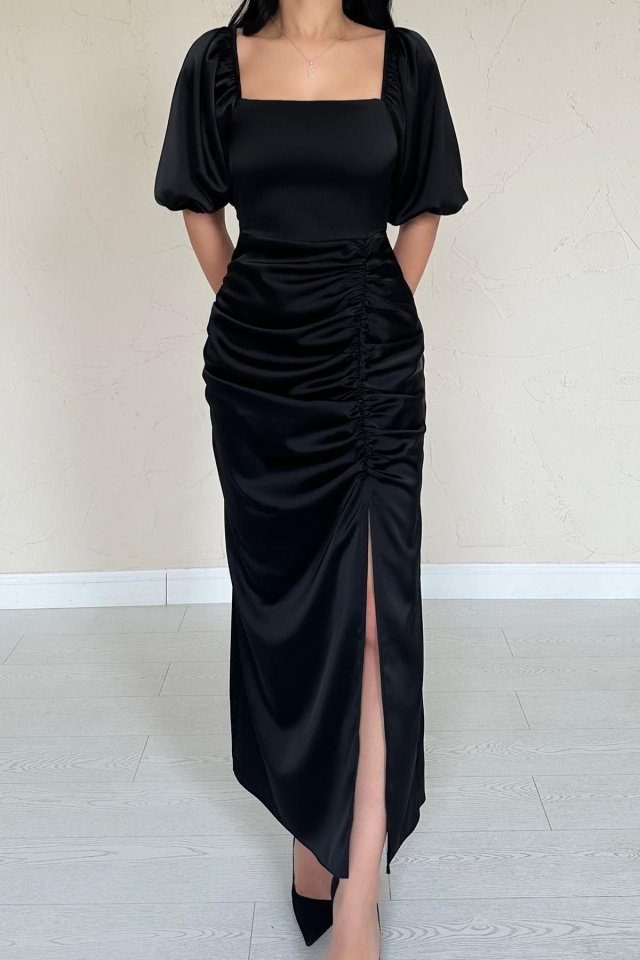 Siyah Büzgülü Saten Elbise