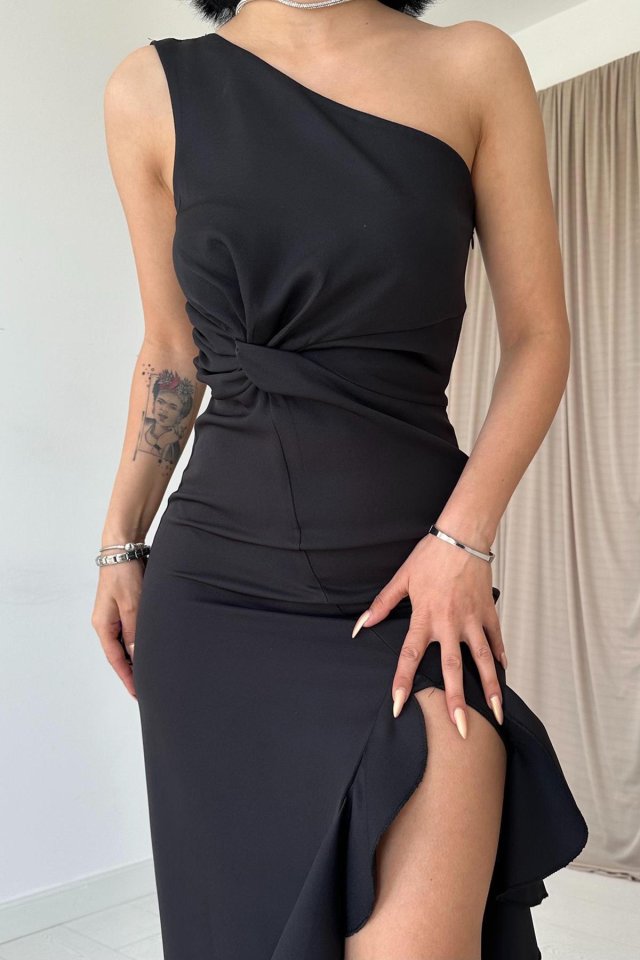 Kadın Kısa Kollu Madonna Yaka Fırfırlı Belden Yırtmaçlı Maksi örme Krep Elbise