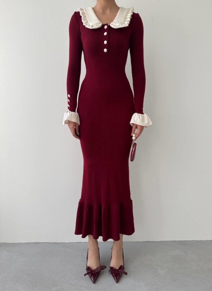 Kadın Kısa Kollu Madonna Yaka Fırfırlı Belden Yırtmaçlı Maksi örme Krep Elbise