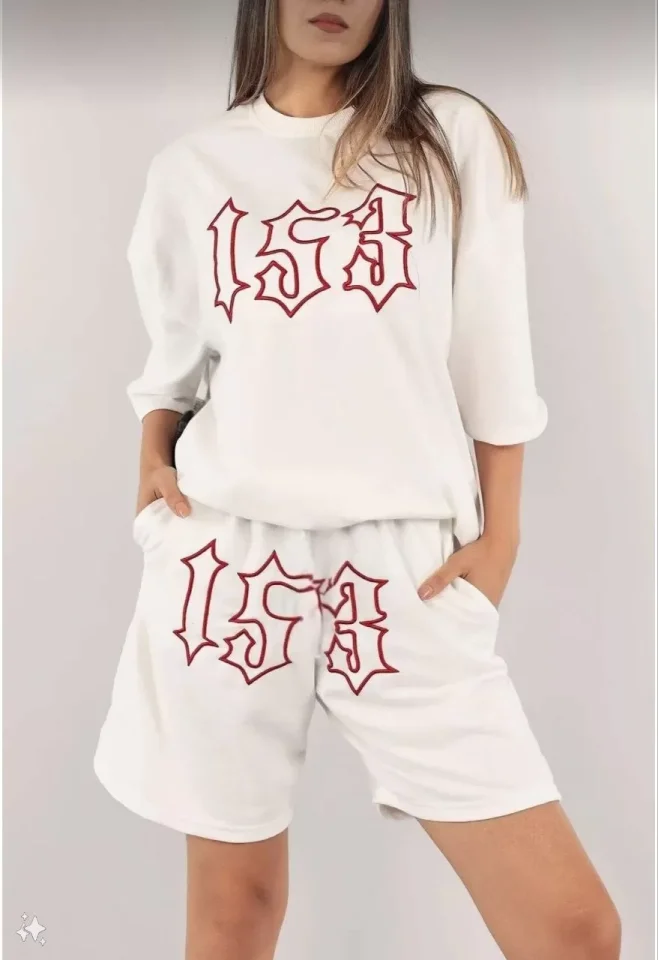 Unisex Nakış İşlemeli Şort Takım – Beyaz