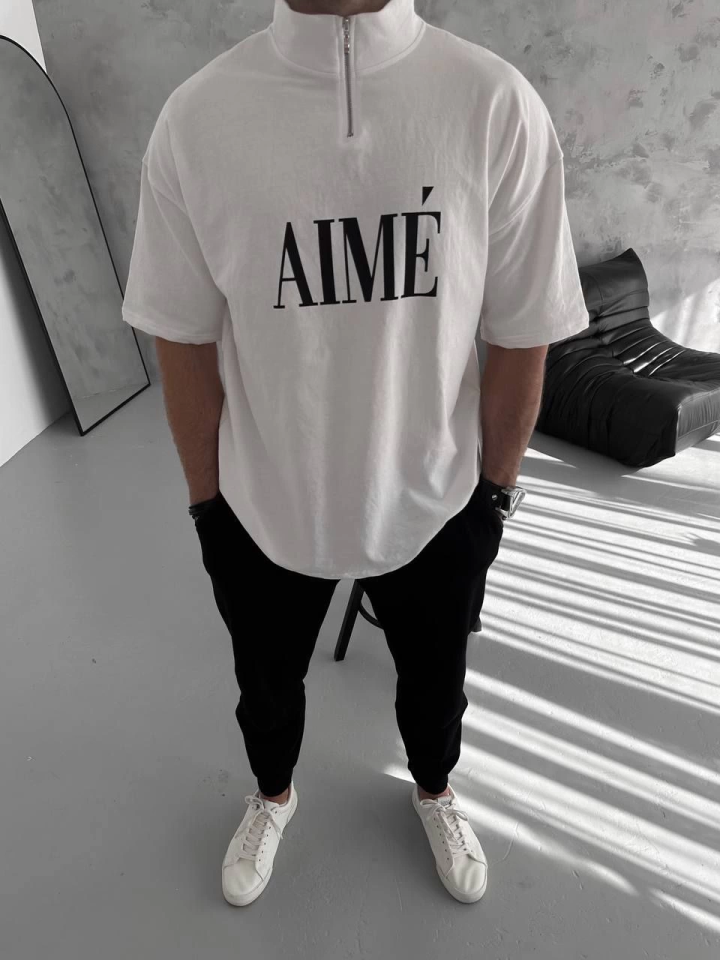 Unisex Yarım Fermuarlı Baskılı T-Shirt – Beyaz