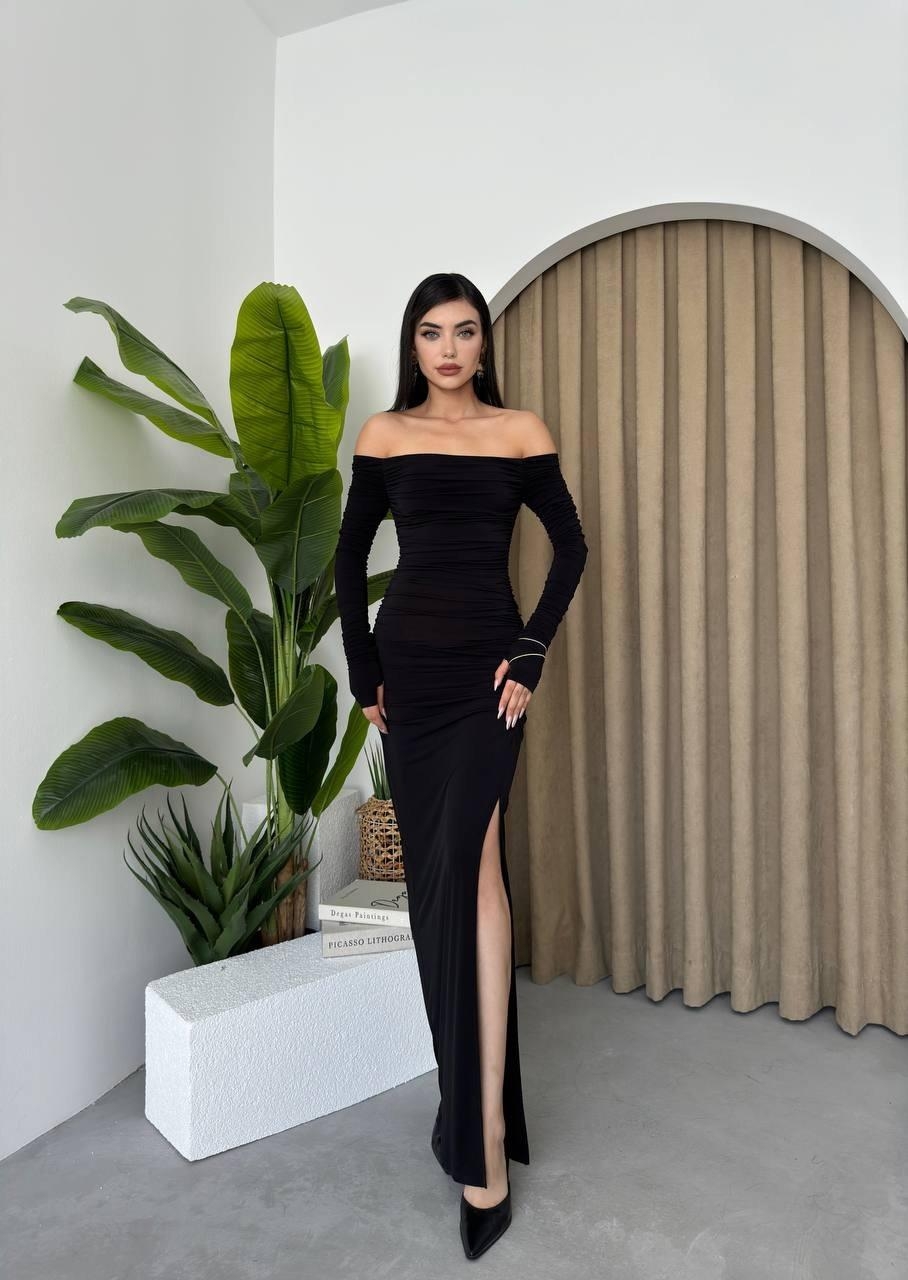 Kadın Kısa Kollu Madonna Yaka Fırfırlı Belden Yırtmaçlı Maksi örme Krep Elbise
