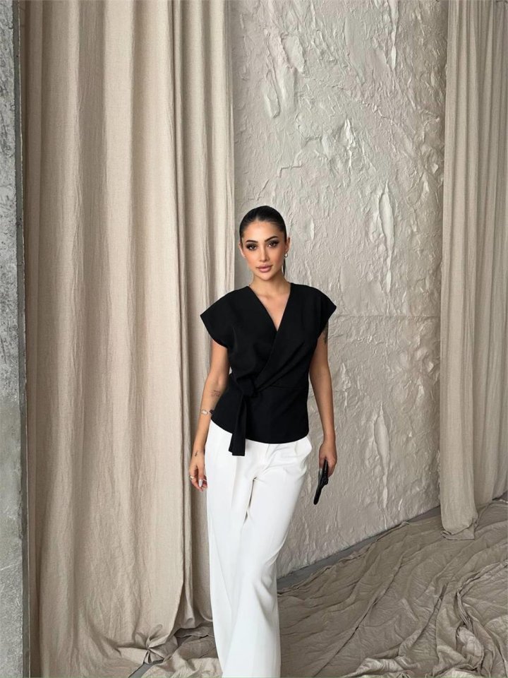 YANDAN BAĞLAMA DETAYLI KOLSUZ BLUZ – Siyah